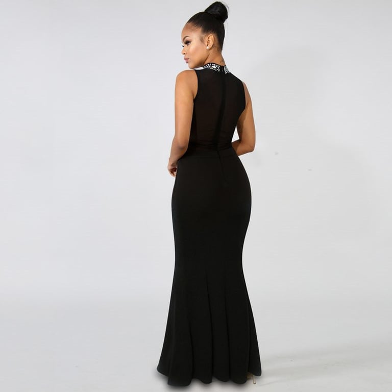 Damen lange Abendkleider mit Kragen. Das Kleid ist leicht tailliert, ärmellos und hat einen Reißverschluss. Der Ausschnitt ist mit glitzernden Steinen verziert, die dem Kleid Glanz verleihen.