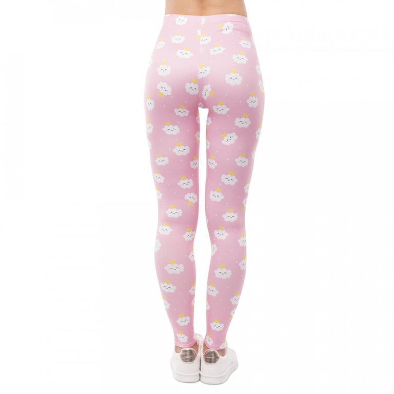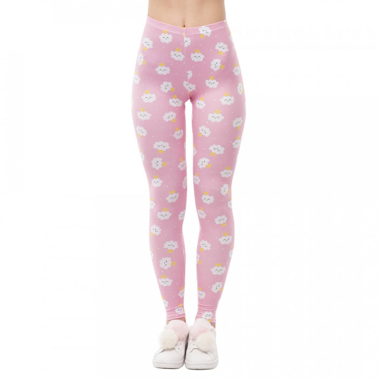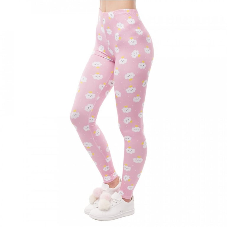 Damenleggings mit hohem elastischen Bund. Lange, schmale Hosenbeine. Bunter Allover-Druck. Niedliches Wolkenmotiv.