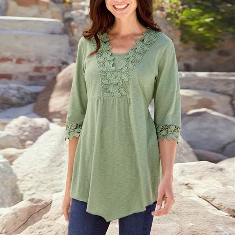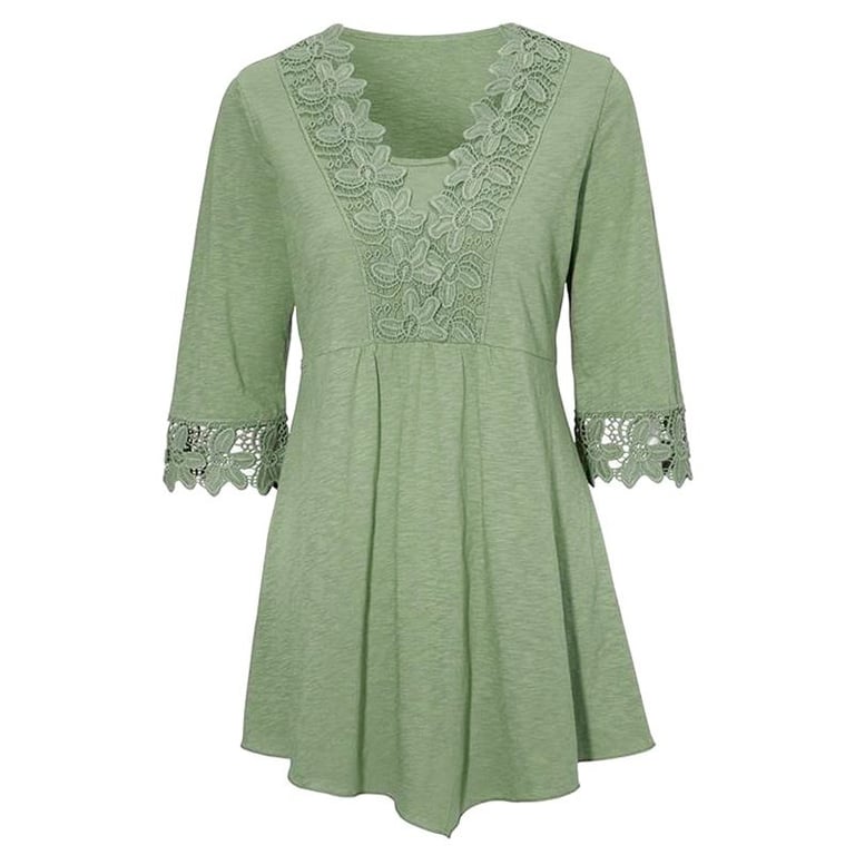 Damen lockeres, fließendes Blusenshirt/Tunika mit dreiviertel, weit geschnittenen Ärmeln. Einfarbig. Die Tunika hat einen V-Ausschnitt. Der Ärmel und der Ausschnitt sind mit floraler Spitze verziert. Längerer asymmetrischer Schnitt. Erhältlich in mehreren Farben.