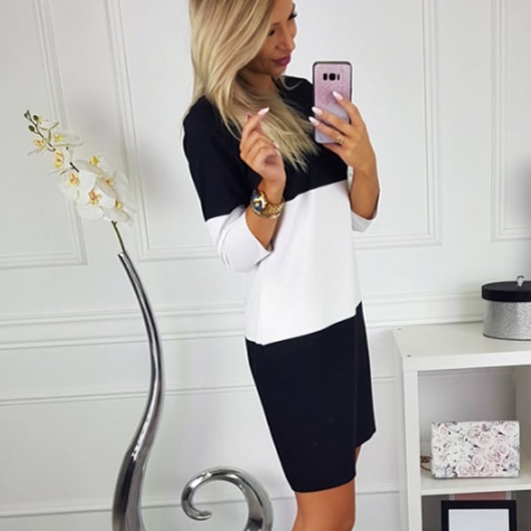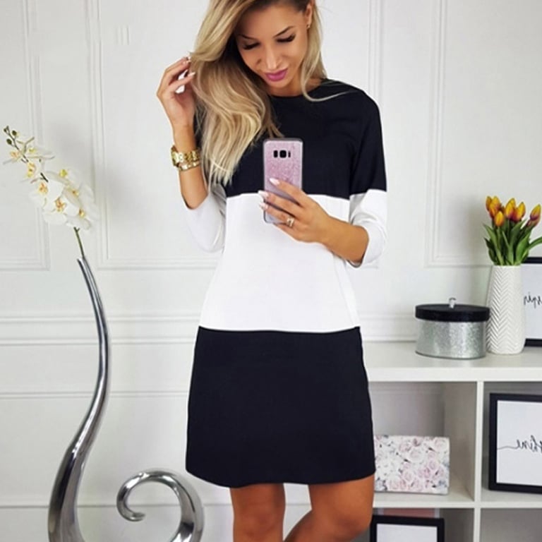 Damen lässiges Kleid mit Dreiviertelärmeln. Das Kleid hat einen runden Ausschnitt und einen lockeren, bequemen Schnitt, ideal für den täglichen Gebrauch. Kombination aus Weiß und Schwarz.