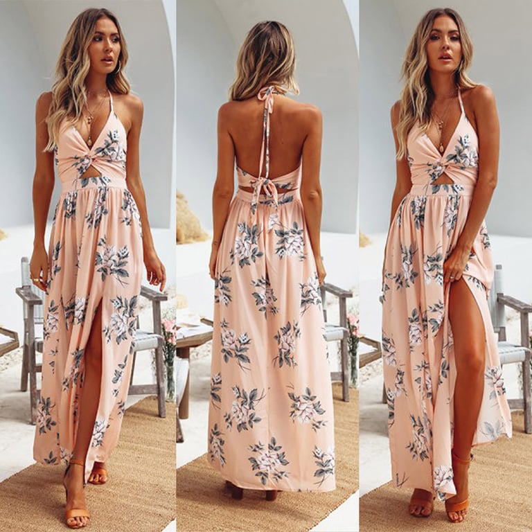 Damen Maxi-Kleid mit schmalen Trägern, die am Nacken gebunden werden, und einem Ausschnitt auf dem Rücken. Langer, fließender Rock mit hohen Schlitzen. In mehreren Farbvarianten erhältlich.