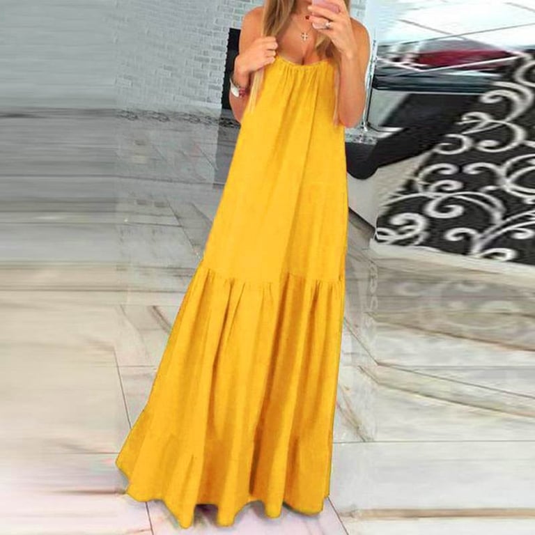 Damen Maxikleid mit Trägern. Rundhalsausschnitt mit Raffung. Langer, lockerer Schnitt. In mehreren Farbvarianten erhältlich.