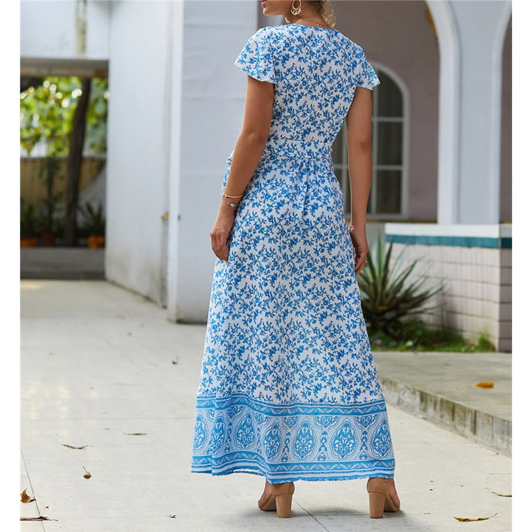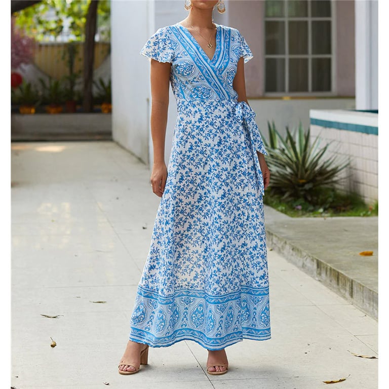 Damen lange Kleider mit kurzen Ärmeln. Lockere Wickeloptik mit einem Bindegürtel in der Taille. Druck mit buntem Muster. Mehrere Farbvarianten.