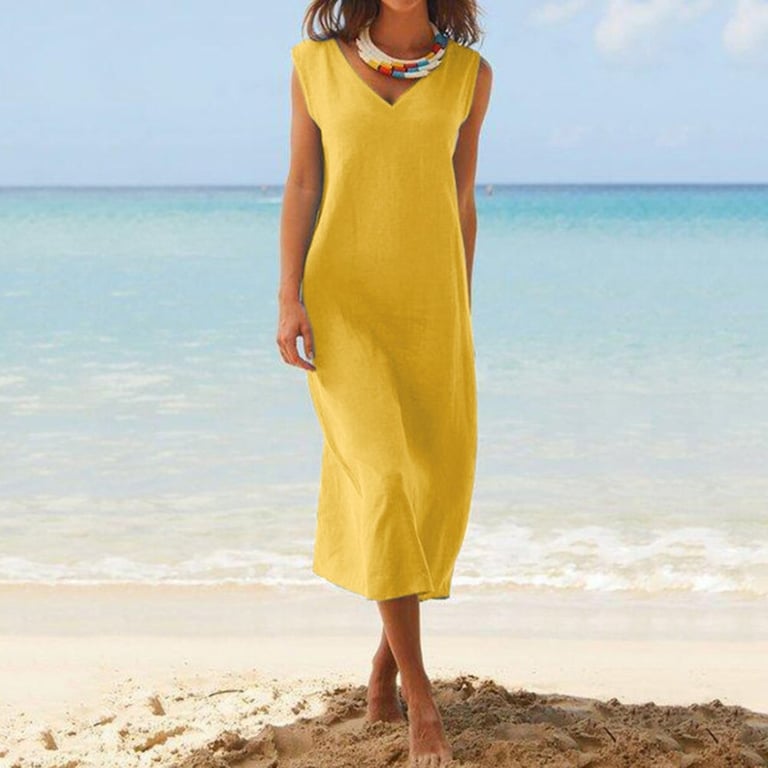 Damen Sommerkleid ohne Ärmel. Lockere, lange Passform mit V-Ausschnitt. Einfarbig. In mehreren Varianten erhältlich.