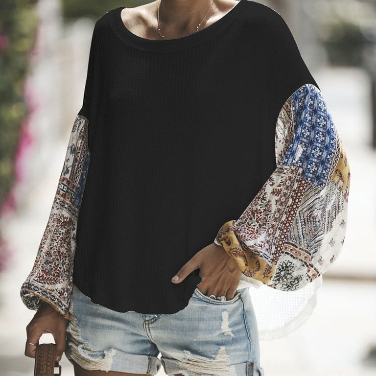 Damen Stricktop, T-Shirt mit Rundhalsausschnitt. Langer, weit geschnittener Ärmel mit buntem Druck. Lockerer, bequemer Schnitt. Erhältlich in mehreren Farbvarianten.