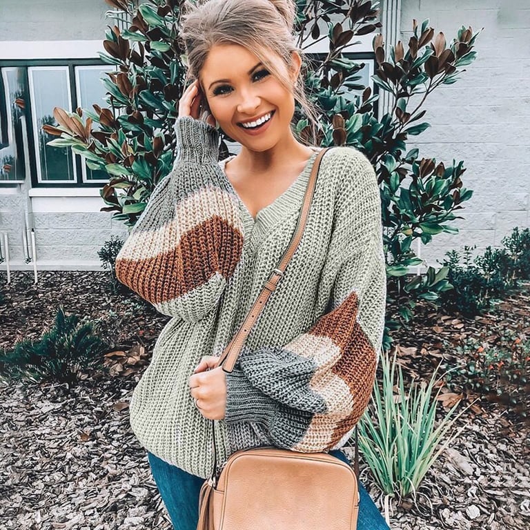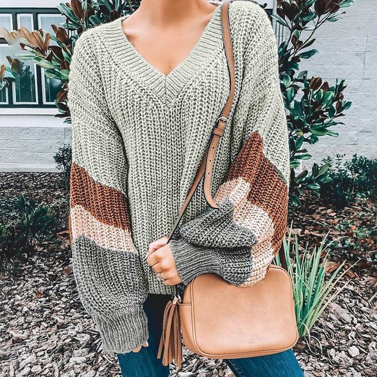 Damen Oversize Pullover mit weitem Ballonärmel. Lockerer, längerer Schnitt mit V-Ausschnitt.