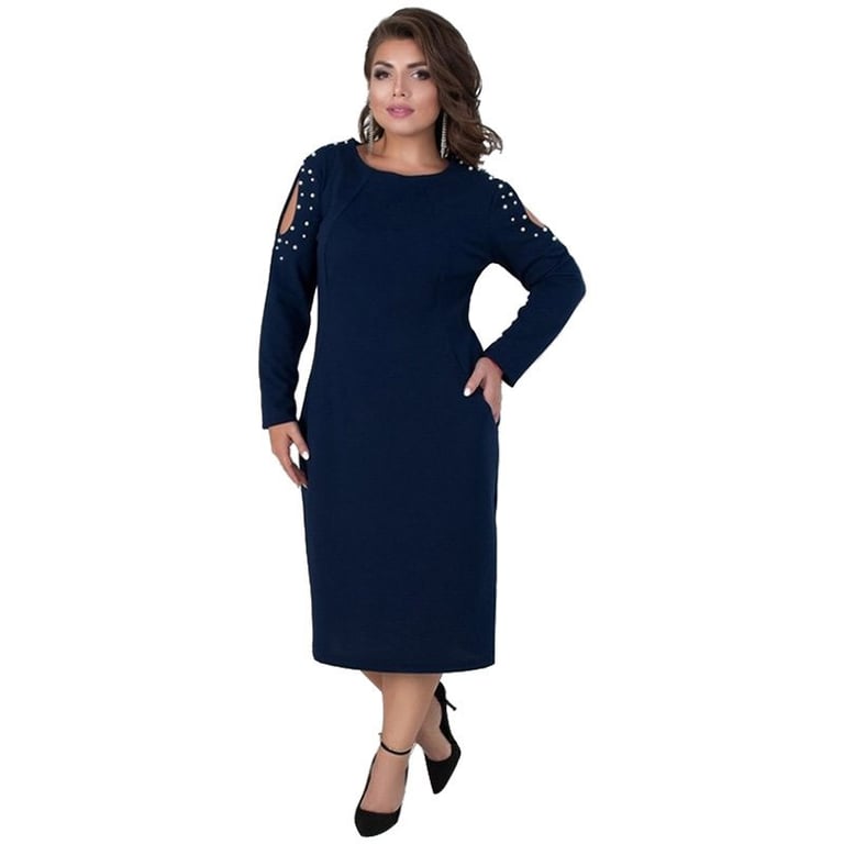 Damenkleid mit langen Ärmeln, verziert mit Perlen. Das Kleid hat einen runden Ausschnitt und einen lockeren, geraden Schnitt mit einer Länge bis zum Knie. Plus-Size-Größen. Erhältlich in mehreren Farbvarianten.
