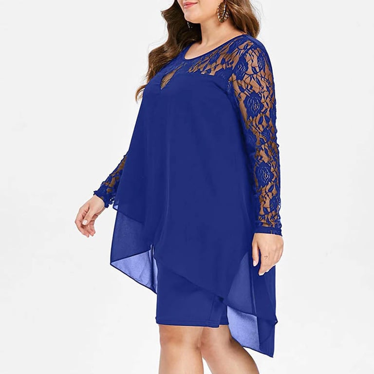 Damenkleid mit langen Ärmeln, verziert mit Spitze. Das Kleid hat einen lockeren Schnitt und einen runden Ausschnitt. Plus-Size-Größen. Erhältlich in mehreren Farbvarianten.
