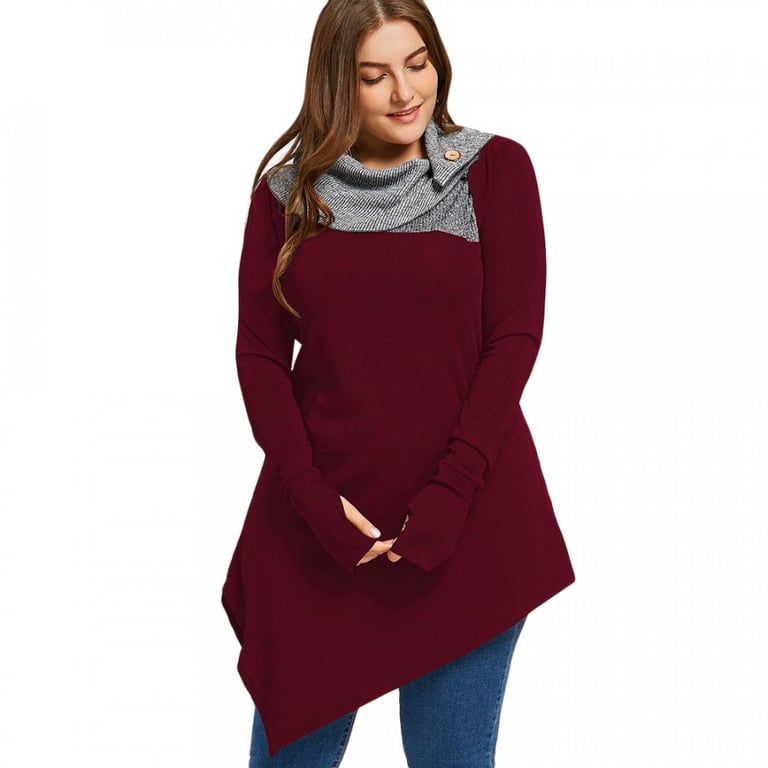 Damen lange Plus-Size Sweatshirt mit asymmetrischem Schnitt und interessant gestalteten Kragen. Erhältlich in drei Farbvarianten.