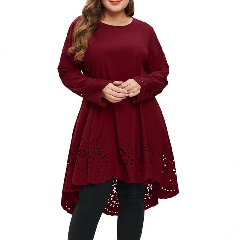 Damenoberteil mit langen, weit geschnittenen Ärmeln und rundem Ausschnitt. Langer asymmetrischer, lockerer Schnitt. Dekorative Lochmusterung. Plus-Size-Größen. In mehreren Farbvarianten erhältlich.