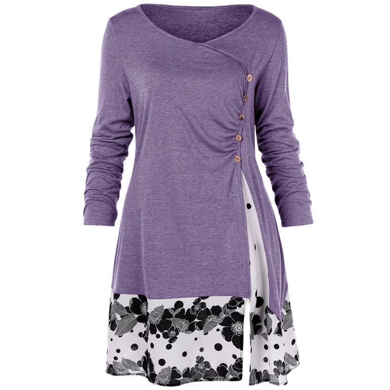 Damen Tunika Bluse mit langen Ärmeln und rundem Ausschnitt. Dekorative Knöpfe auf der Vorderseite. Teil mit Blumenmuster. Plus-Size-Größen. In mehreren Farbvarianten erhältlich.