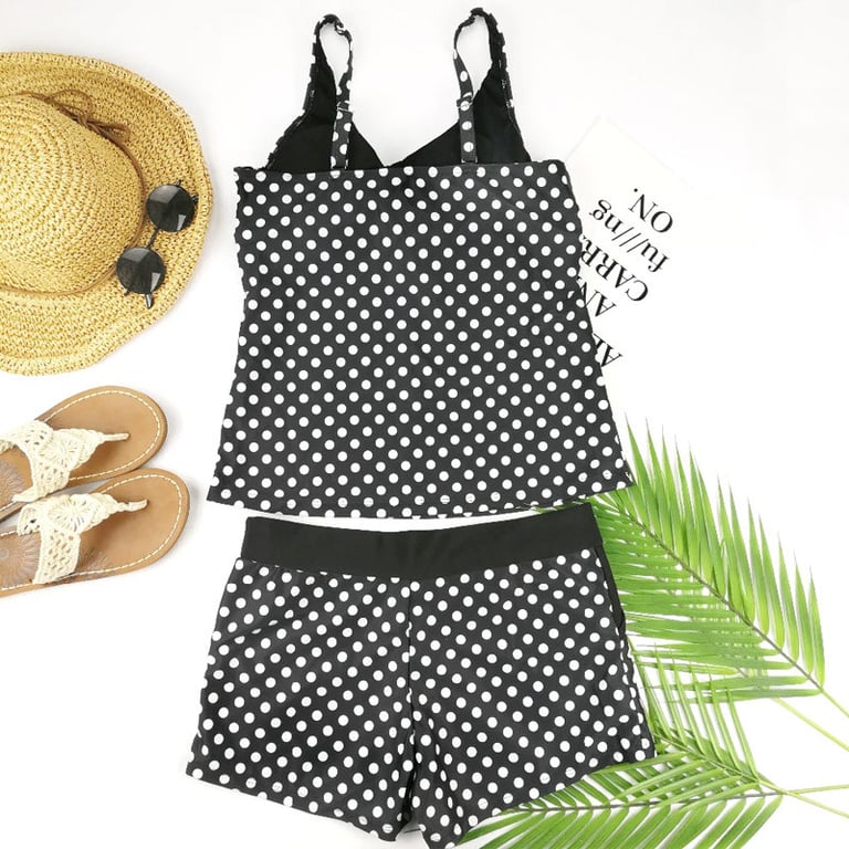 Damen Zweiteiler Badeanzug im Tankini-Stil mit Push-Up-Effekt. Der Badeanzug hat einen V-Ausschnitt und schmale Träger. Der Unterteil mit Shorts und elastischem Bund. Bedruckt mit gepunktetem Muster. Erhältlich in drei Farbvarianten.