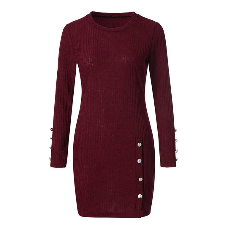 Damenkurzes Kleid mit langen Ärmeln. Enganliegender Schnitt mit Knopfdetails am unteren Teil und an den Ärmeln. Erhältlich in mehreren Farbvarianten.