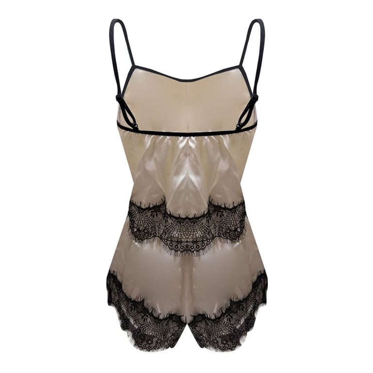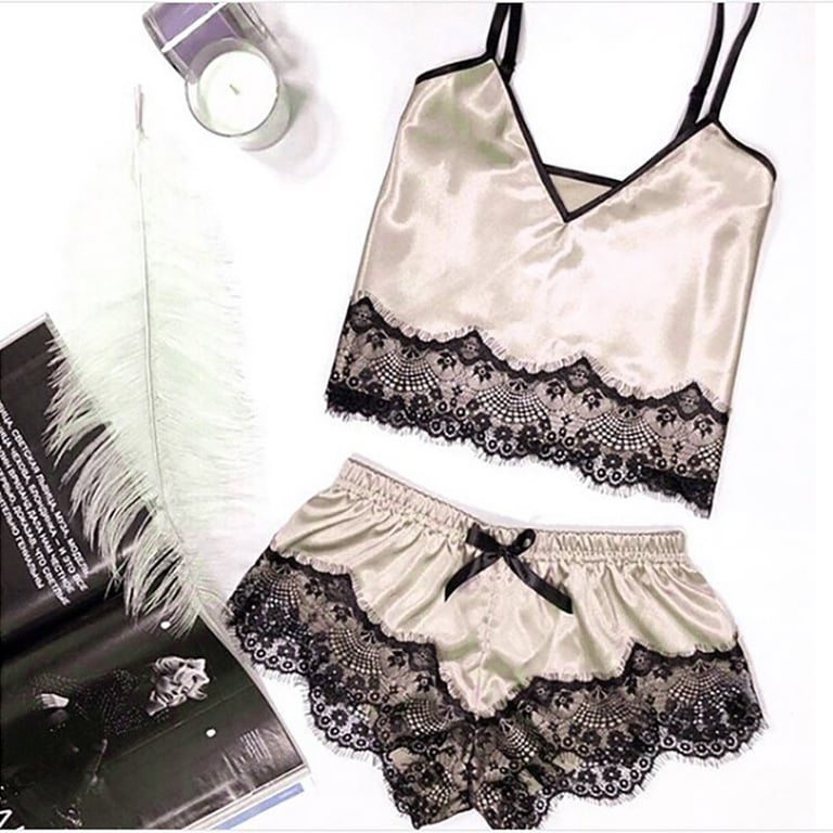 Set aus Damen-Satin-Pyjama mit Spitze. Das Set enthält ein Top mit schmalen Trägern und kurze Hosen mit elastischem Bund. Erhältlich in mehreren Farbvarianten.