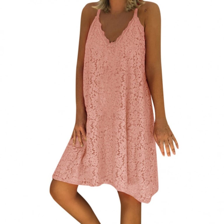 Damenkleid mit schmalen Trägern und V-Ausschnitt. Lockere Passform mit Spitzenverzierung. In mehreren Farben erhältlich.