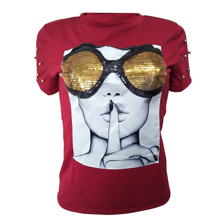 Das T-Shirt hat eine elegante Verzierung mit Strasssteinen an den Ärmeln und einen schönen Druck. Es passt zu jedem Outfit.