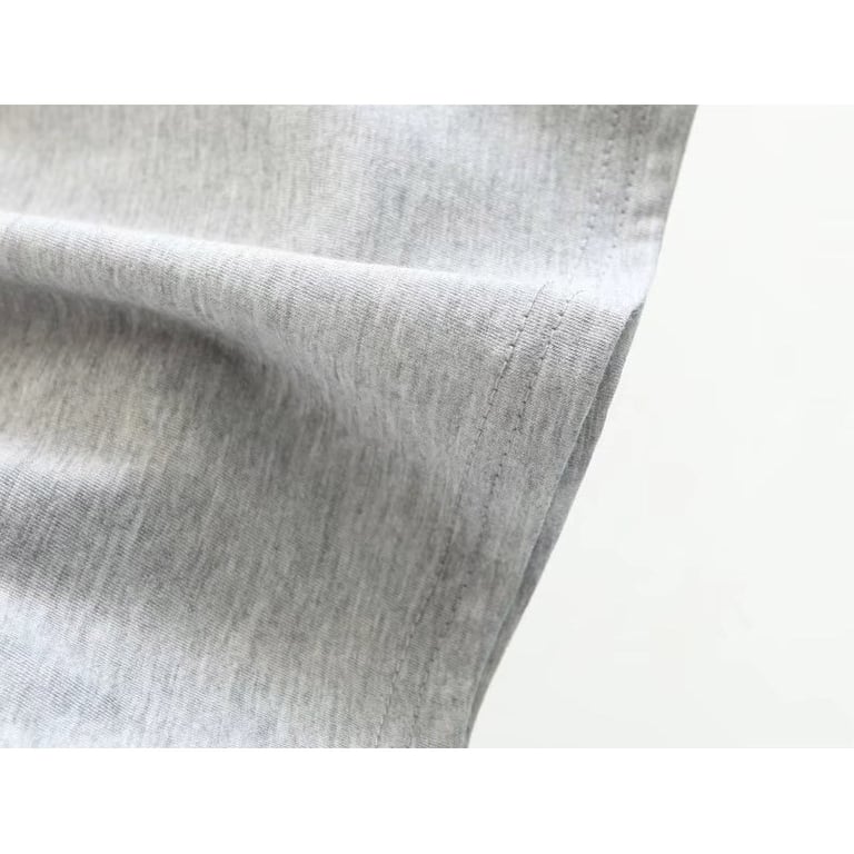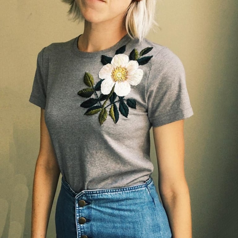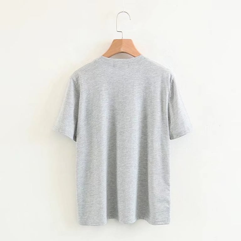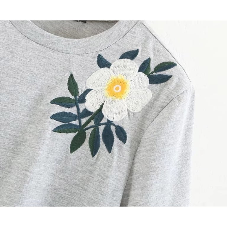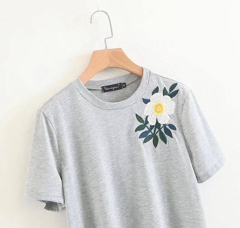Damen T-Shirt in grauer Farbe mit kurzen Ärmeln und rundem Ausschnitt. Das T-Shirt hat auf der Brust ein aufgenähtes weißes Blumenmotiv.