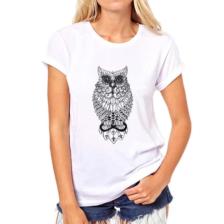 Schönes Damen-T-Shirt mit originellem Eulenmotiv, das Ihnen gut stehen wird.