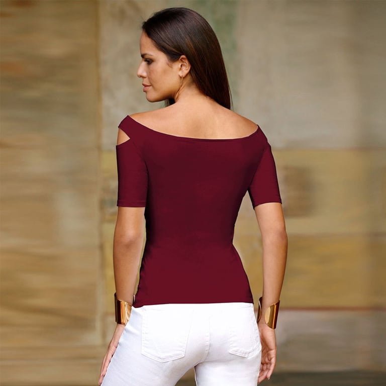 Damen T-Shirt mit kurzen Ärmeln und freiliegenden Schultern. Das Shirt hat einen runden Ausschnitt und Ausschnitte an den Ärmeln. Erhältlich in drei Farben – schwarz, weiß, weinrot.