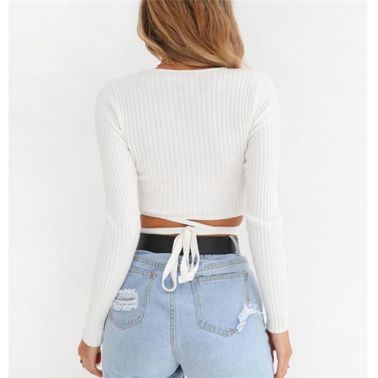 Damen Ripp-Crop-Top mit langen Ärmeln. Wickeloberteil mit Schleifenbindung. Tiefer V-Ausschnitt. Erhältlich in drei Farben.