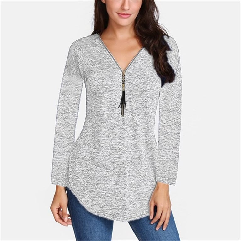 Damenoberteil mit langen Ärmeln. Lockere, längere Passform mit Melange. V-Ausschnitt mit dekorativem Reißverschluss. In mehreren Farbvarianten erhältlich.