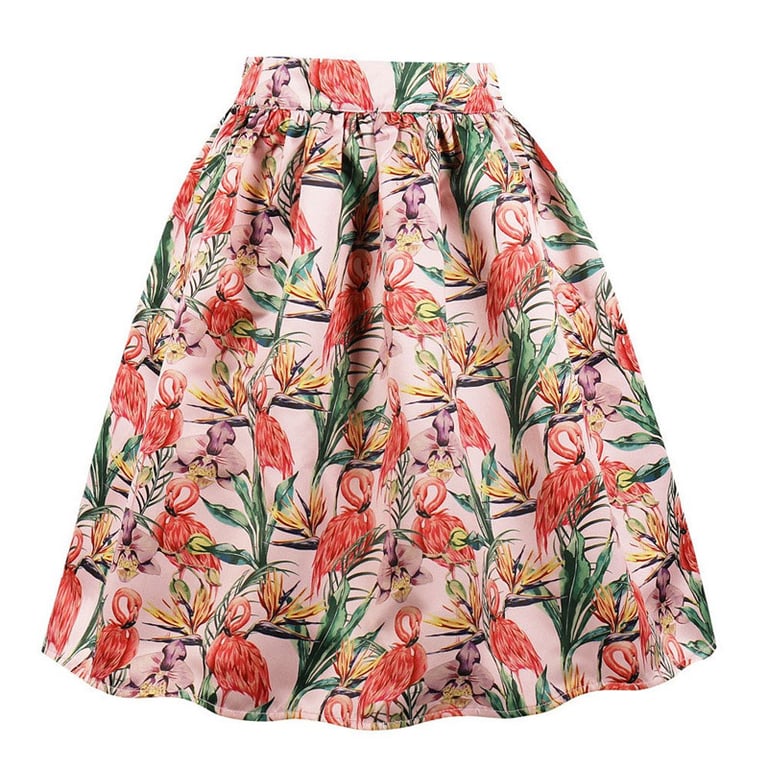 Damenrock im Vintage-Stil. Weit ausgestellter Schnitt mit hoher Taille. Reißverschluss. Bedruckt mit buntem Muster. In mehreren Farbvarianten erhältlich.
