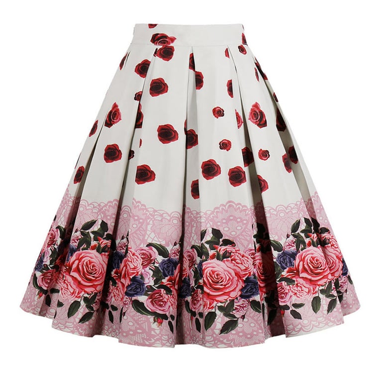 Damenrock im Vintage-Stil mit hoher Taille. Weit ausgestellter Schnitt. Bunte Druckmuster. In mehreren Varianten erhältlich.