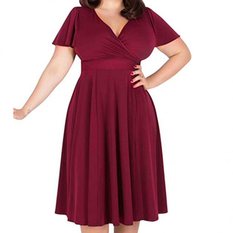 Damen Wickelkleid mit tiefem V-Ausschnitt. Lockere Passform mit Bindeband in der Taille und kurzen Ärmeln. Erhältlich in mehreren Farbvarianten.
