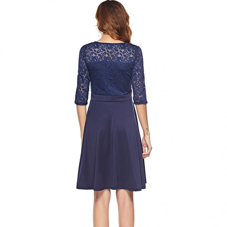 Damenabendkleid mit Spitzenoberteil und 3/4-Ärmeln. Das Kleid ist tailliert und hat einen fließenden Rock bis zum Knie. Erhältlich in mehreren Varianten.