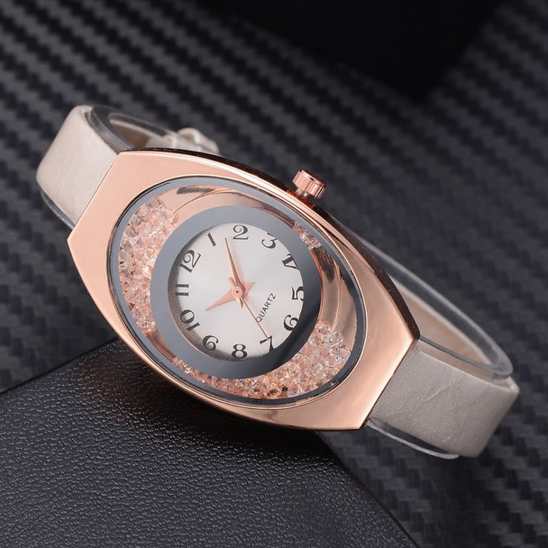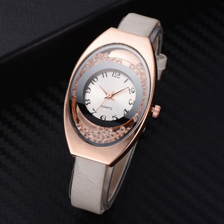 Damen elegante Uhren mit einem Armband in Lederoptik und einem interessant gestalteten Ziffernblatt. Auswahl aus zwei Farbvarianten.