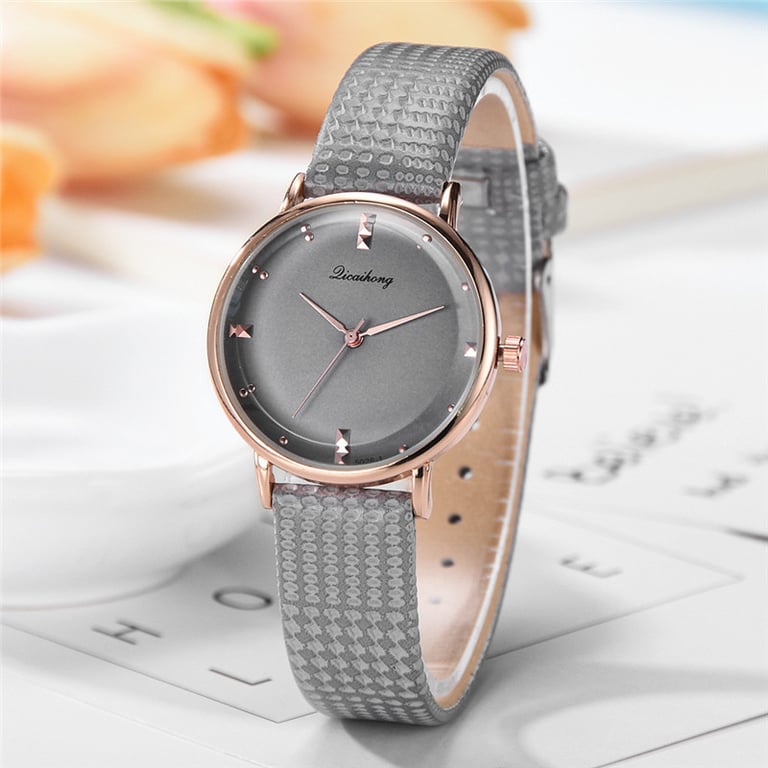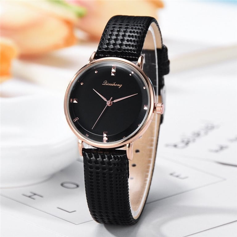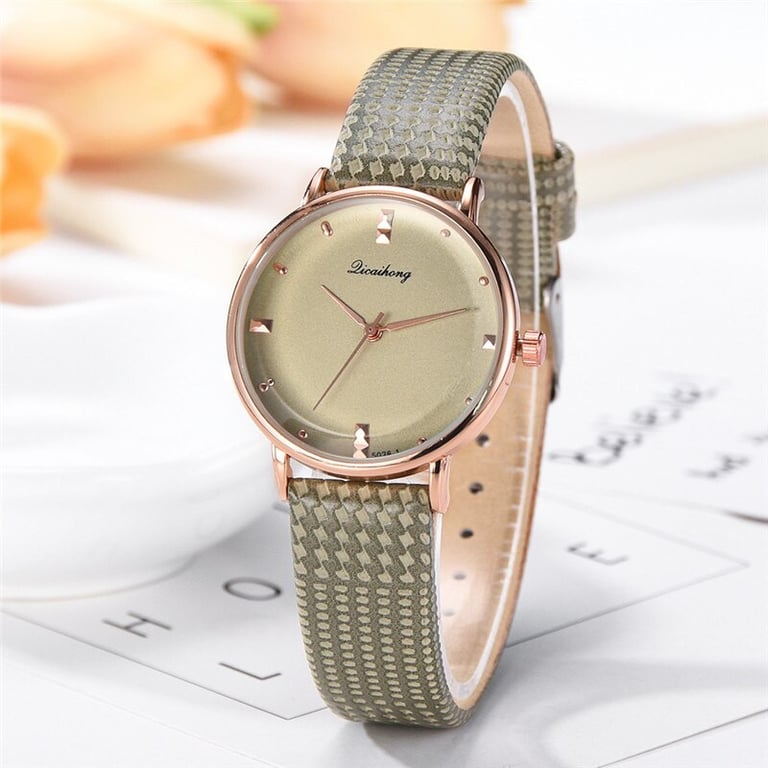 Damenarmbanduhren mit einem originellen Kunstlederarmband. Zifferblatt in Goldfarbe mit kleinen Steinen. In mehreren Farbvarianten erhältlich.