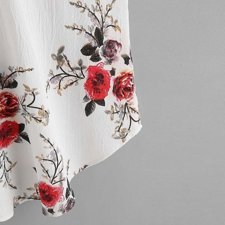 Damenbluse ohne Ärmel. Lockere Passform mit V-Ausschnitt und buntem Blumenmuster. Breite Träger.