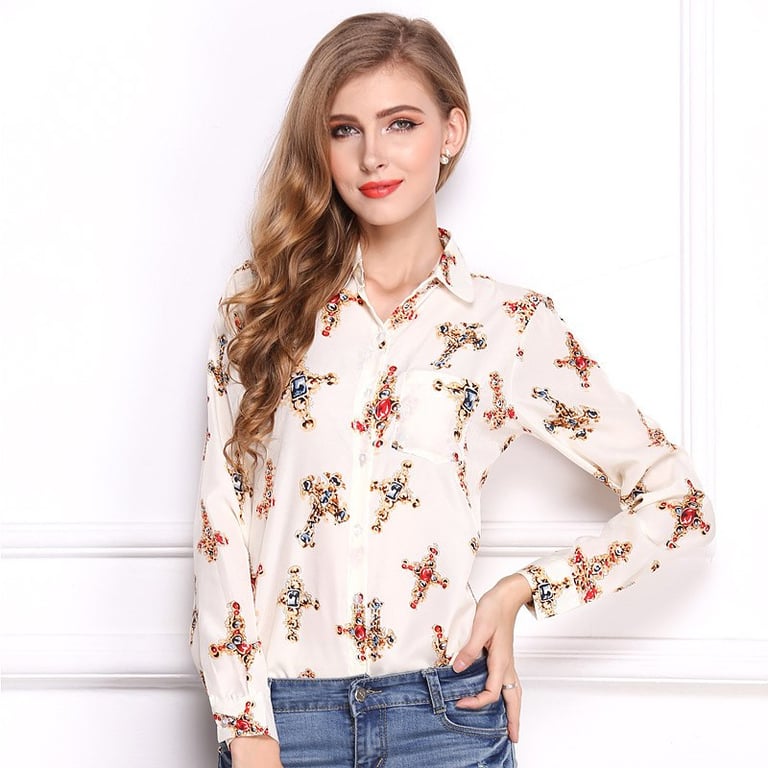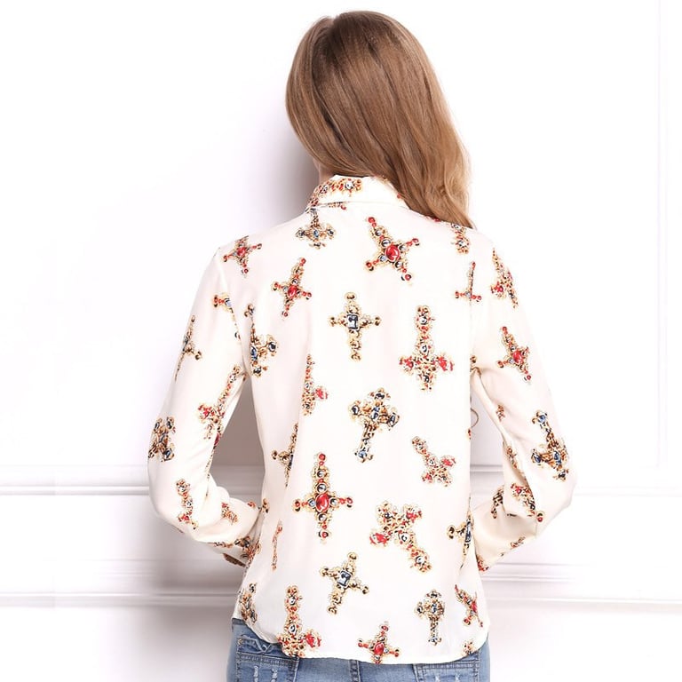 Damenbluse mit langen Ärmeln. Die Bluse hat einen Kragen und eine Knopfleiste. Figurbetonter Schnitt. Bedruckt mit buntem Muster. Erhältlich in zwei Varianten.
