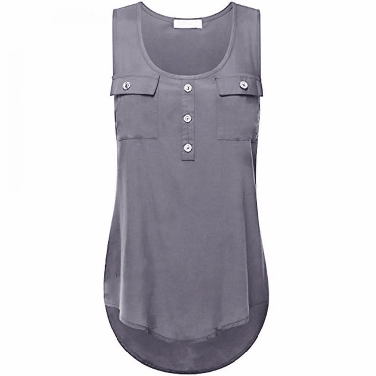 Damenbluse ohne Ärmel mit rundem Ausschnitt. Die Bluse hat eine dekorative Knopfleiste und zwei Brusttaschen. Leicht. Luftig. Plus-Size-Größen. In mehreren Farbvarianten erhältlich.