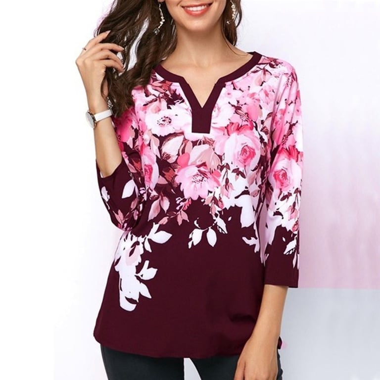 Damenbluse mit buntem Blumenmuster. Die Bluse hat 3/4-Ärmel und einen lockeren, geraden Schnitt. Plus-Size-Größen. In mehreren Varianten erhältlich.