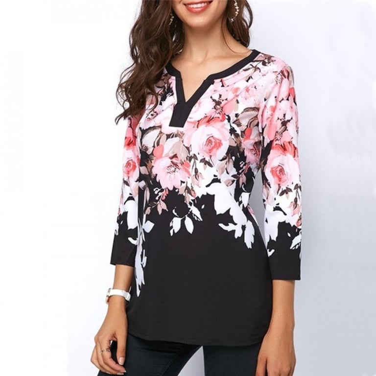 Damenbluse mit buntem Blumenmuster. Die Bluse hat 3/4-Ärmel und einen lockeren, geraden Schnitt. Plus-Size-Größen. In mehreren Varianten erhältlich.