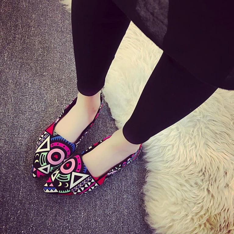 Damen Ballerinas mit buntem geometrischem Muster. Die Ballerinas haben eine spitze Form und eine flache Sohle ohne Absatz.