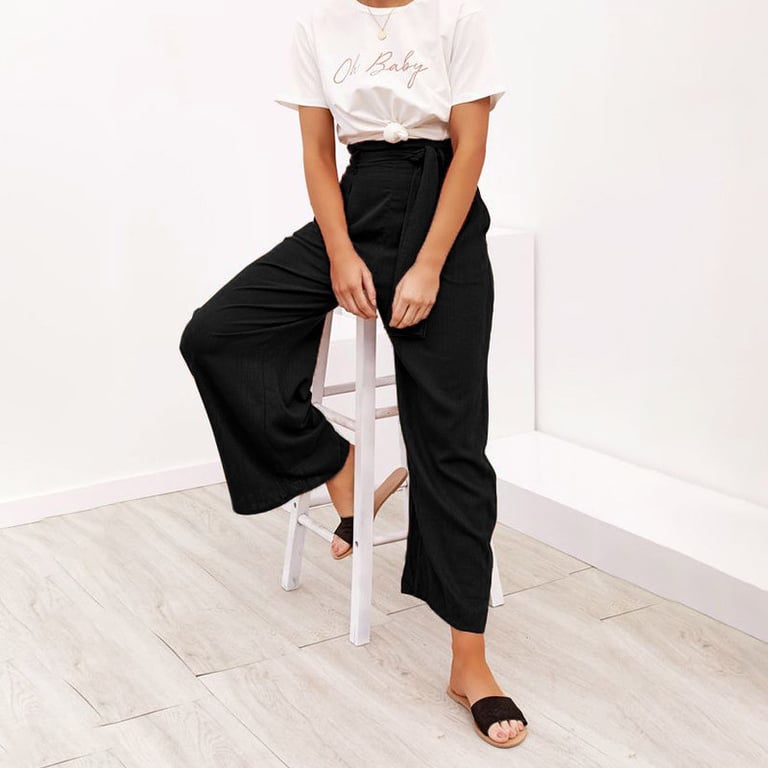 Damenweite Hose mit hohem Bund. Leichter, luftiger Stoff. Bindegürtel in der Taille. In mehreren Farbvarianten erhältlich.