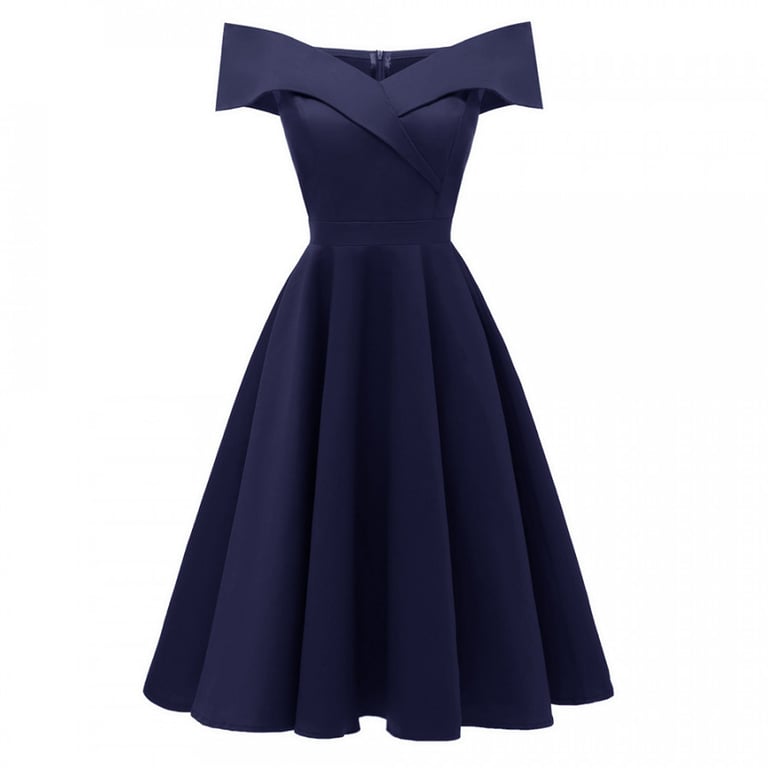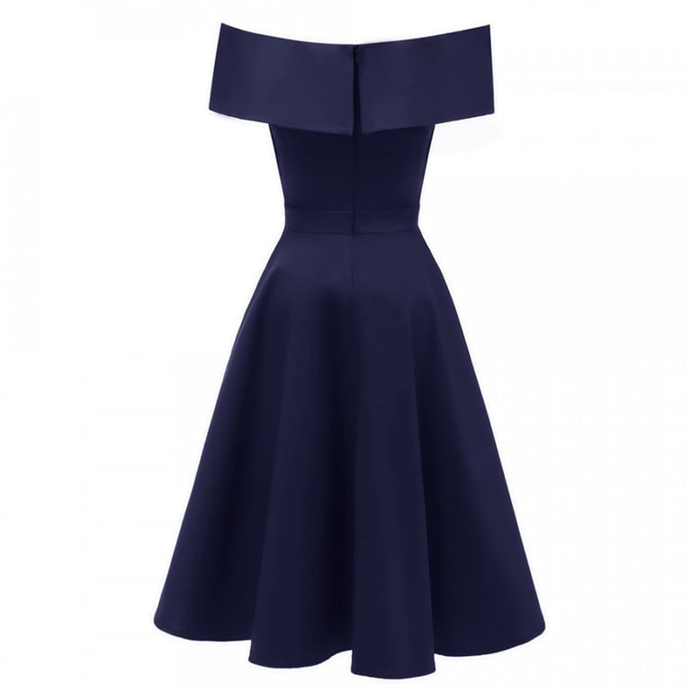 Damenabendkleid mit freiliegenden Schultern. Das Kleid hat einen weiten, schwingenden Rock und einen Reißverschluss auf der Rückseite. Erhältlich in zwei Farben – Blau und Rot.
