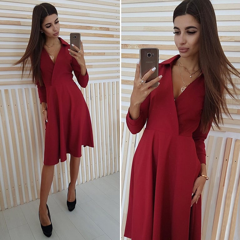 Damenkleid mit plissiertem, lockerem Rock und knielanger Länge. Das Kleid hat lange Ärmel und einen V-Ausschnitt mit Kragen. Erhältlich in mehreren Farbvarianten.