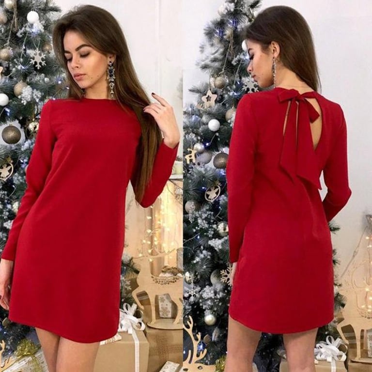 Damenkurzes Kleid in lockerer Passform mit langen Ärmeln. Das Kleid hat einen V-Ausschnitt auf der Rückseite und eine Schleifenbindung. Erhältlich in mehreren Farbvarianten.