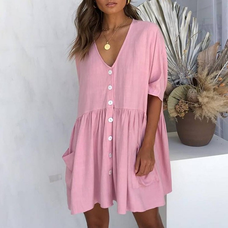 Damenkleid mit Knopfverschluss. Das Kleid hat kurze Ärmel und einen V-Ausschnitt. Lockere Passform mit Raffung und zwei seitlichen Taschen. In mehreren Farbvarianten erhältlich.