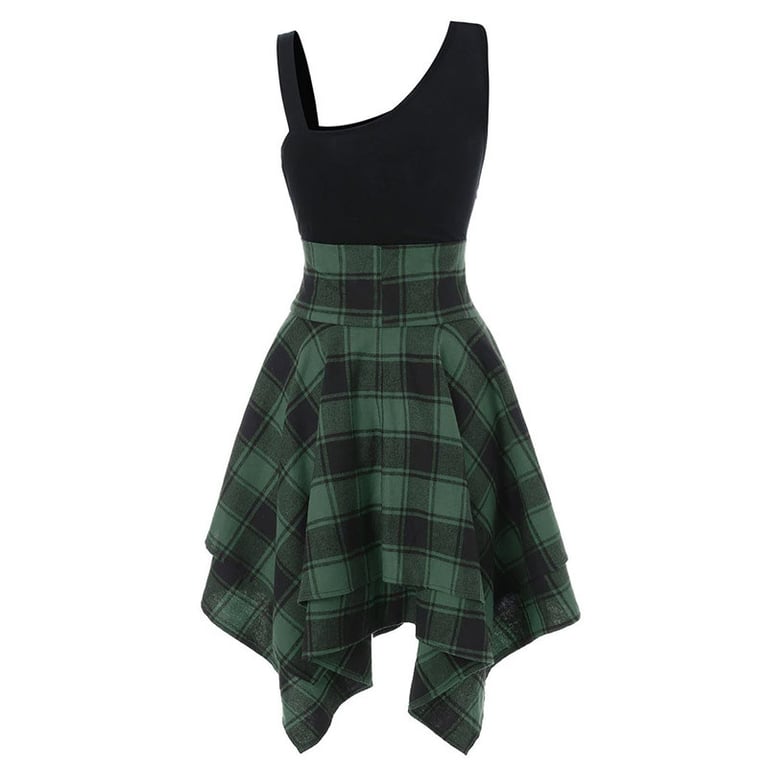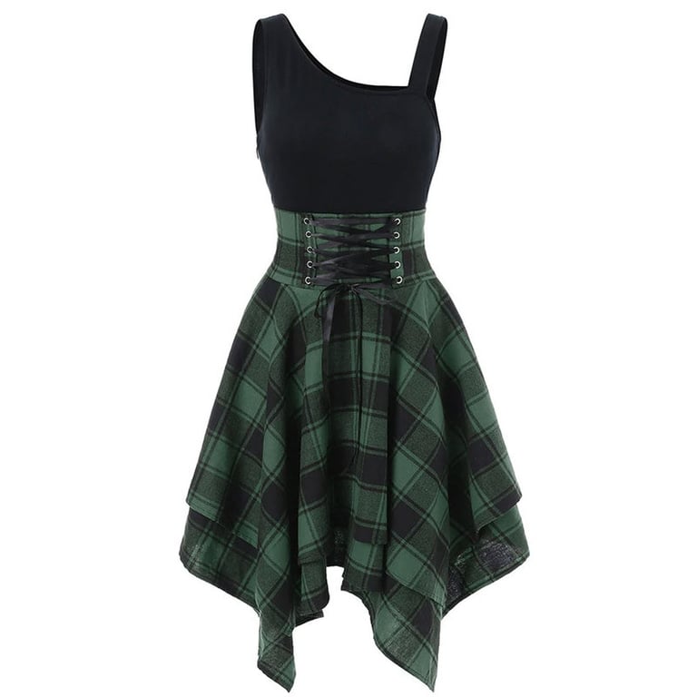 Damenkleid mit Korsettbindung in der Taille. Kurzer Rock mit kariertem Muster und asymmetrischem Schnitt. In mehreren Farbvarianten erhältlich.