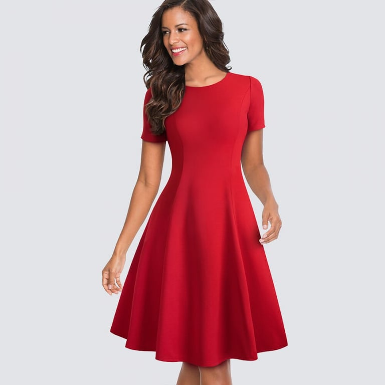 Damenabendkleid mit kurzen Ärmeln und rundem Ausschnitt. Tailliert in der Taille. Mit gerafftem A-Linien-Rock. Knielange. Zwei Farbvarianten.