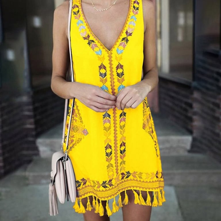 Damenleichte Kleider mit breiteren Trägern und V-Ausschnitt. Lockere kurze Passform mit Fransen und buntem Druck. Mehrere Varianten.