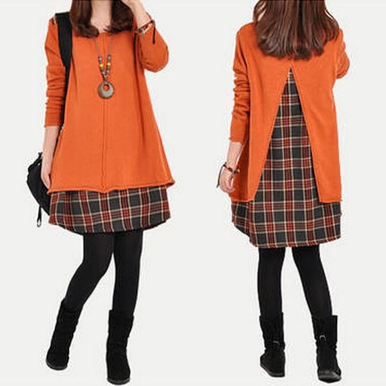 Damenkurzes Kleid im Vintage-Stil. Das Kleid hat einen runden Ausschnitt und lange Ärmel. Eingearbeiteter unterer Teil mit kariertem Muster. Erhältlich in mehreren Varianten.