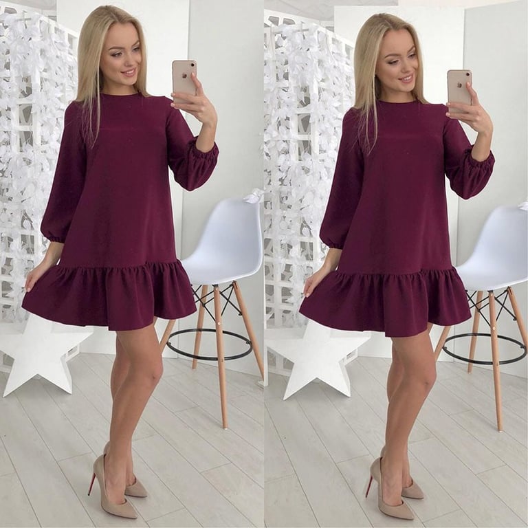 Damenkleid im lockeren Schnitt mit kurzem Rock und Volant. Das Kleid hat einen runden Ausschnitt und lange Ballonärmel. Erhältlich in mehreren Farben – schwarz, grün, weinrot.