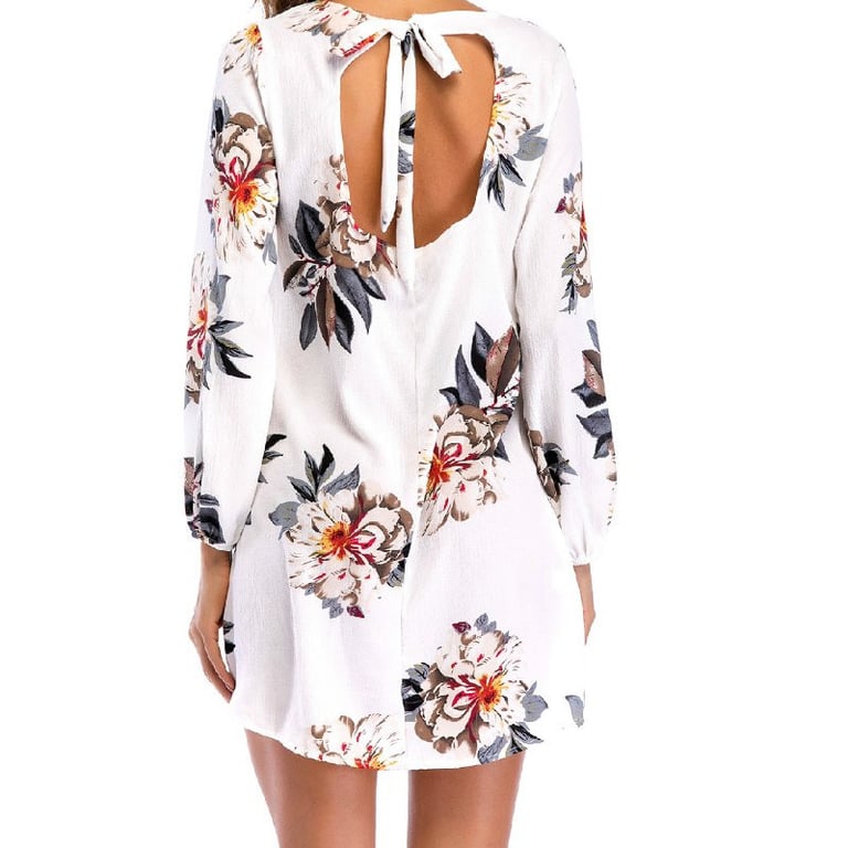 Damenstylisches Kleid mit Blumenmotiv. Das Kleid hat einen kurzen, lockeren Schnitt und einen Ausschnitt mit Schnürung auf dem Rücken. Erhältlich in mehreren Farbvarianten.