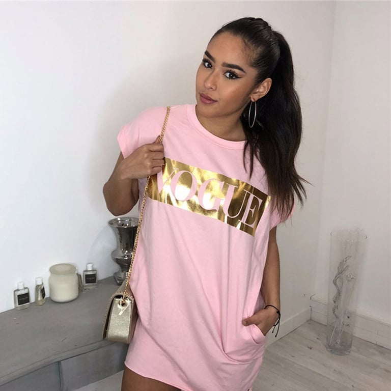 Damenstylisches Kleid mit seitlichen Taschen. Lockere Passform mit kurzen Ärmeln und rundem Ausschnitt. Goldener Druck mit Schriftzug auf der Vorderseite. Erhältlich in mehreren Farbvarianten.