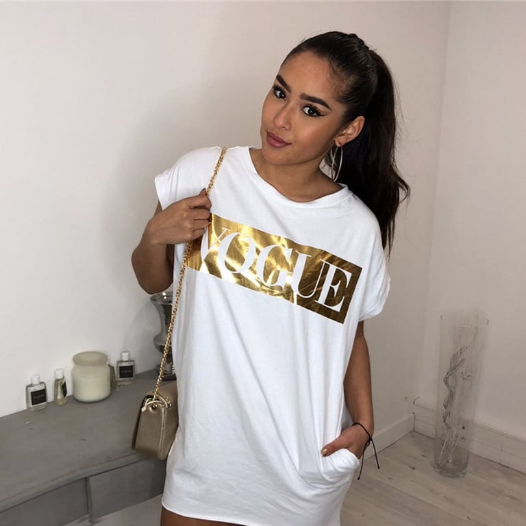 Damenstylkleid mit seitlichen Taschen. Lockere Passform mit kurzen Ärmeln und rundem Ausschnitt. Goldener Druck mit Schriftzug auf der Vorderseite. Erhältlich in mehreren Farbvarianten.